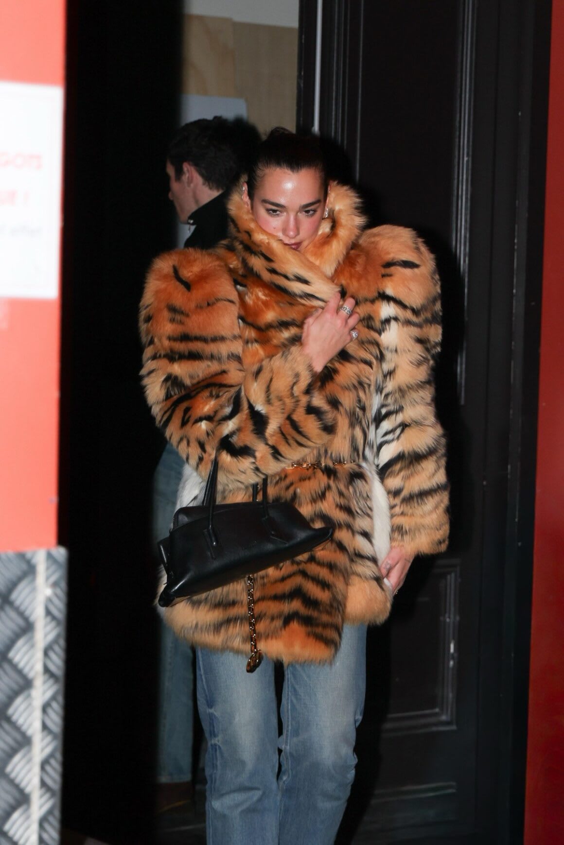 Dua Lipa wore Gucci ‘La Famiglia’ look 22 shearling coat and chain belt with double G detail on February 20, 2026 in Paris, France.