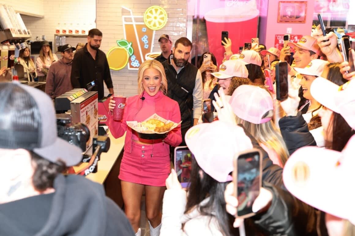 Country Music star Megan Moroney lit up Raising Cane’s Times Square Global Flagship on February 20, 2026 under the glow of the neon Chicken Finger sign at her “Cloud 9” listening celebration with fans.