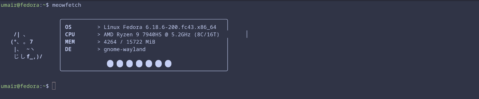 Everyone has a favorite fetch tool. Some people want minimal output, some want detailed system stats, some just want color schemes they can brag about. I love cats, so meowfetch has a special place on my system. It shows system info with a cat themed output and that is enough reason for me.