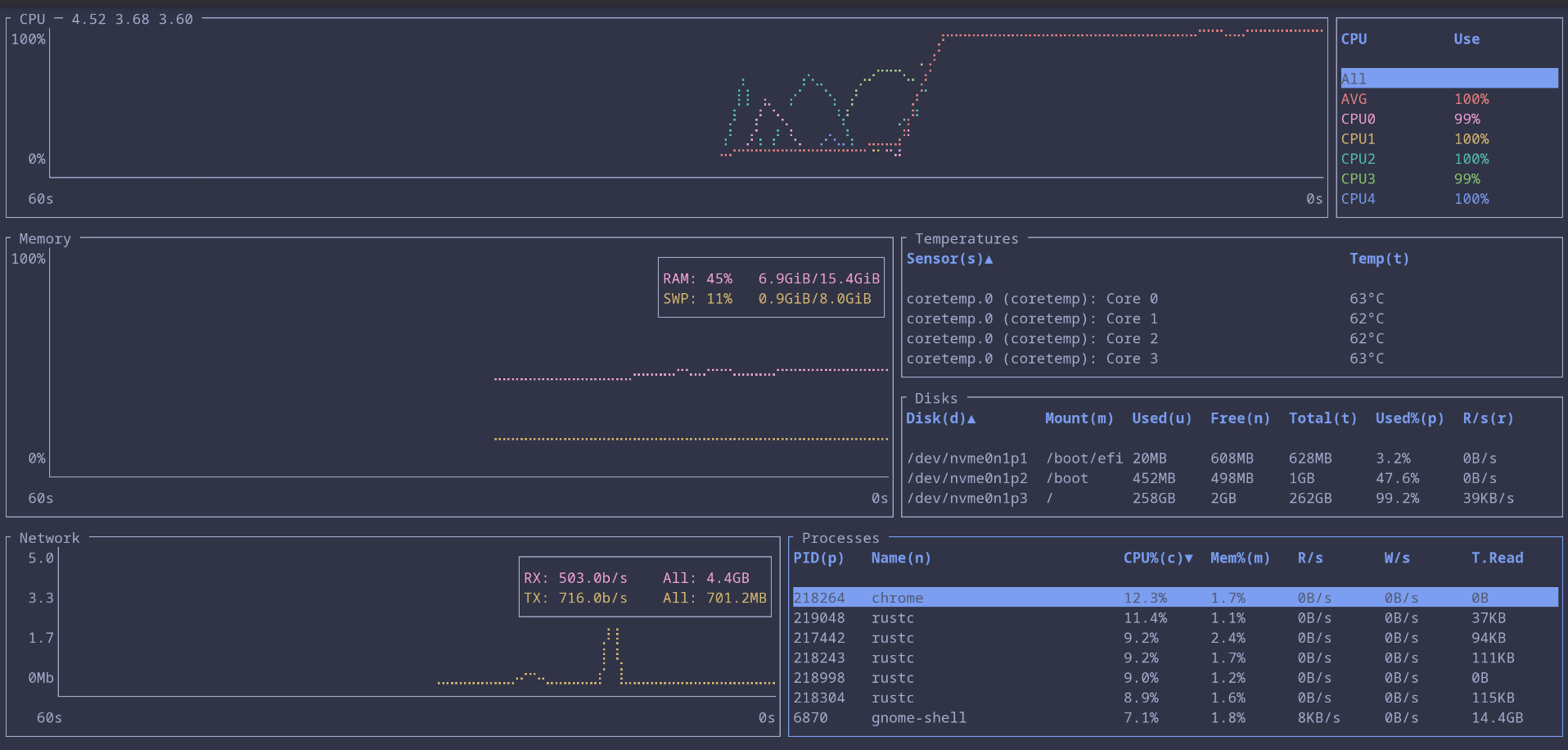 top and htop have earned their place, but Bottom provides a layout that I can read faster. It shows CPU, memory, network, and disk activity in a smooth, uncluttered format and processes are much more easier to sort and filter.